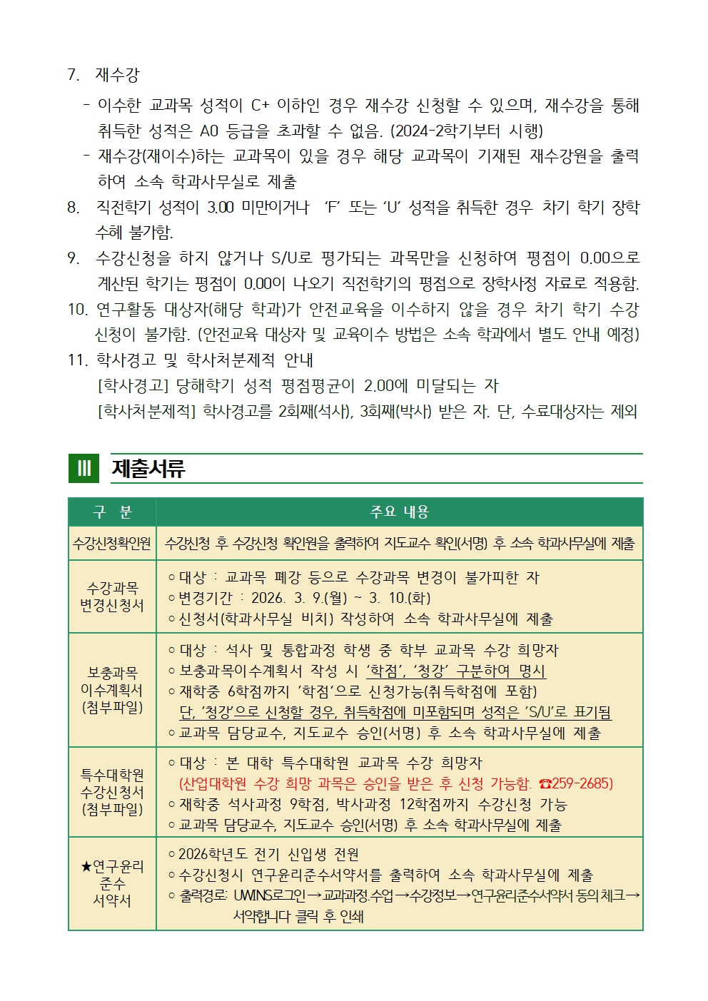 [제출서류] 1. 수강신청확인원 - 제출대상: 수강신청 한 재학생 - 제출기간: 3월 6일(금) 15시까지 - 제출장소: 14호관(인문관) 306호(글로벌인문학부 통합사무실 2) 2. 수강과목 변경신청서 - 제출대상: 교과목 폐강으로 수강과목 변경이 불가피한 자 - 변경기간: 3월 9일(월)~3월 10일(화) - 제출장소: 14호관(인문관) 306호(글로벌인문학부 통합사무실 2) 3. 보충과목 이수계획서 - 제출대상: 석사 및 통합과정 학생 중 학부 교과목 수강 희망자 - 제출기한: 3월 6일(금) 15시까지 - 제출장소: 14호관(인문관) 306호(글로벌인문학부 통합사무실 2) 4. 특수대학원 수강신청서 - 제출대상: 본 대학 특수대학원 교과목 수강 희망자 - 제출기한: 3월 6일(금) 15시까지 - 제출장소: 14호관(인문관) 306호(글로벌인문학부 통합사무실 2) 5. 연구윤리 준수 서약서 - 제출대상: 2026학년도 전기 신입생 전원 - 제출기한: 3월 6일(금) 15시까지 - 제출장소: 14호관(인문관) 306호(글로벌인문학부 통합사무실 2) 자세한 내용은 첨부파일 확인바랍니다 |