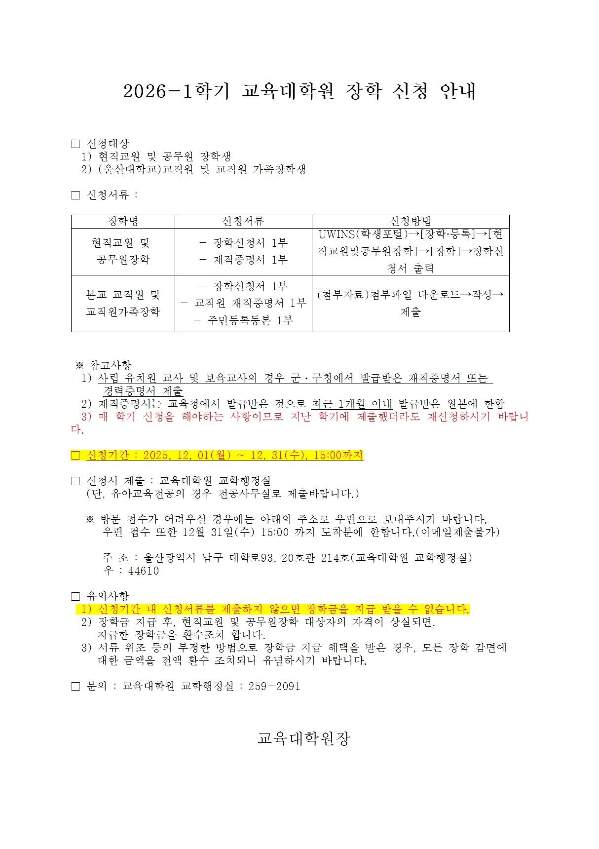 2026학년도 1학기 교육대학원 장학 신청 안내